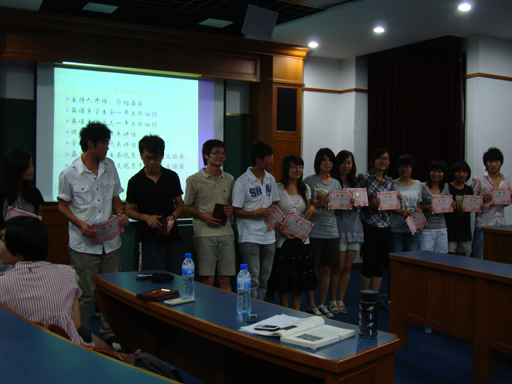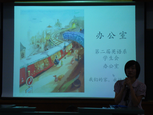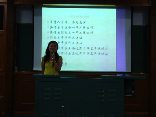 介绍完到场嘉宾后,主持人分别邀请学生会、团总支代表回顾这一学年来的工作。首先是学生会代表周毓赟,回顾了学生会各个部门一年中举办的活动,最初办公室举办的军训征文比赛,学术部举行的辩论赛、话剧比赛等充满学术性的活动,文体部带来欢乐气息的迎新、圣诞晚会,宣传的设计,外联为活动忙碌奔波,女生部贴心的女生节活动……毓赟学姐肯定所有部门在一年中成功的举办了许多活动,同时提议每次活动后都要做好总结,扬长避短,保留好的经验与传统,改善不足之处,这样才能把今后的活动越办越好。团总支代表刘必铮说时刻保持着一颗爱心,温暖的心,以“一年时光”为线,总的介绍了这一年来团总支各个部门联合分工举办的活动,经历过迎接与慰问新生,到过爱欣敬老院,见证团总支第一个生日,举行过两大特色活动月——“国际文化交流月”和“我们的青春”活动月,还有和团活动息息相关的“两优一先”评选等等令人难忘的活动。必铮学长对于我们的组织,我们的活动以及我们分别提出自己的看法,并对未来我们举办团总支的活动报以期望。