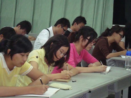 首先,潘新老师以 “CCTV杯英语演讲比赛福建赛区复赛近期将于本院举行”此则新闻为例,让同学们进行导语(所谓导语指的是新闻首段具有概述性的语言)的现场写作练习。不出所料,这次试探性的写作结果并不理想。于是潘新老师对第一次接触新闻稿的同学们引入了新闻报道的基本概念以及新闻报道的五要素(即时间,地点,人物,事件,原因)。