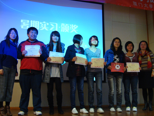 除此之外,还有刘流等同学的《莱姆实习生活》、王老师的《实习在深圳》的总结、陈晓霞关于《将军山实习报告》的发言以及对各项优秀实习成果的颁奖,都展示了英语系团总支不断壮大的骄傲。