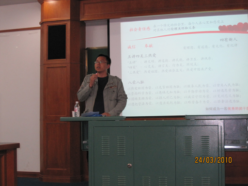 通过对这些优秀社会青年事例的介绍,易老师引导我们进入了对共青团意识层面的认识。他主要讲了“五讲四美三热爱”、“八荣八耻”等道德观;中国社会主义共青团的目标:培养四有新人,即有理想、有道德、有文化、有纪律。又通过一些时事,如现今的人民币利率的相关问题等,为我们阐述了四有新人应如何从现在做起,如何从身边做起的深刻道理。