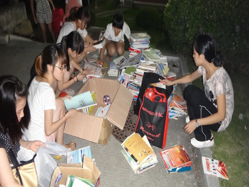 英语系团总支青年志愿者队开展的“资源共用 文化共享”图书捐赠活动于2012年6月15日晚七点开始。此次活动和图书馆合作,由志愿者上门收集各年级同学的教材及课外书籍。