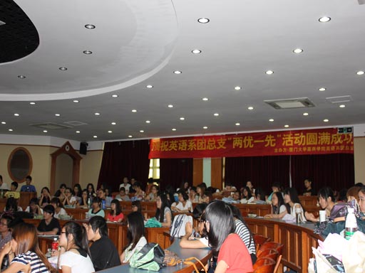 英语系团总支"两优一先"宣讲会暨表彰大会于2012年6月15日中午12:30在人文B#301举行,参加此次活动的嘉宾有学工部王协老师,各系行政秘书兼辅导员老师,以及09-11全体学生。