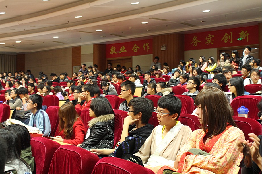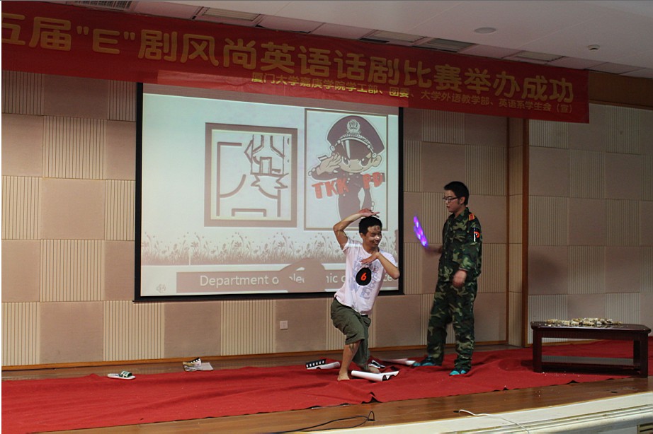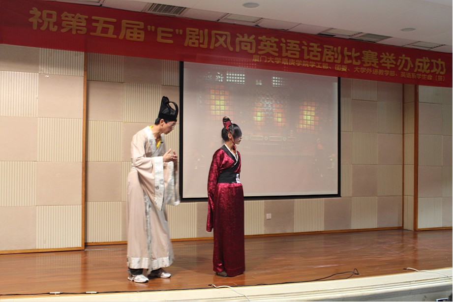 2012年12月18日晚7点,在厦门大学嘉庚学院主楼群三号楼小报告厅,第五届“E”剧风尚英文话剧决赛精彩上演。出席本次比赛的评委、嘉宾有英语系执行主任杨昆老师,外教Stephen ling、Karen li,以及大外部辜莹莹、梅家象老师等。