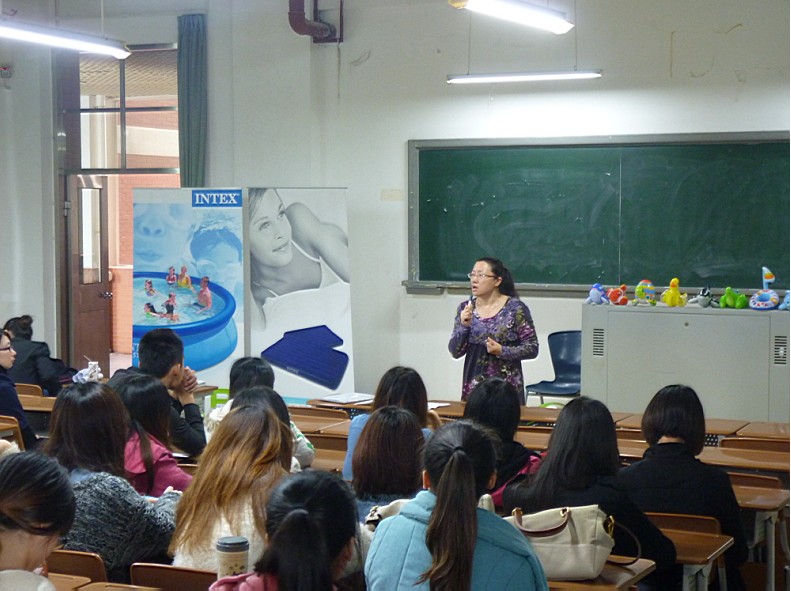 及其他工作人员。通过详细介绍,同学们得知这是一家以生产休闲运动娱乐器材及其配套电子电器为主的公司。我系优秀毕业生首甜甜现任职于该公司,她用