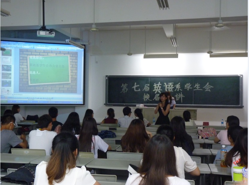 今天下午6点,在公一303教室举行了英语系第七届学生会换届选举宣讲会。此次竞选的人数高达30人,比往届参加竞选的人数要多,充分显现了同学们的热情。本次宣讲会邀请到的嘉宾有学生会的最高领导者,陈毅超老师,以及英语系主席团和其他各系的主席团代表。