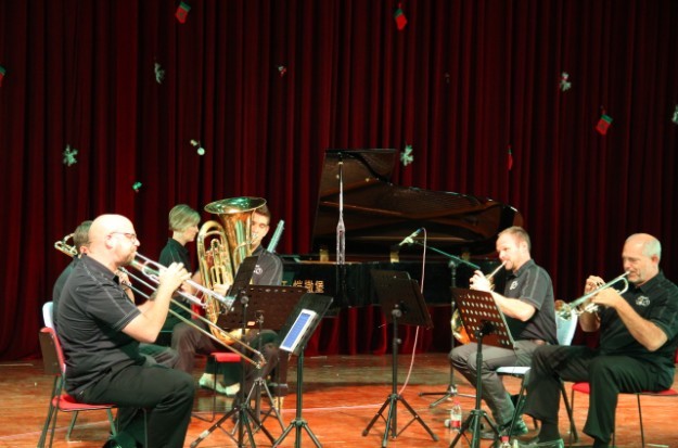 走进大报告厅,现场一派浓浓的西洋景象。平日经典的红色背景幕布,星星点点地挂上了圣诞袜和雪花装饰物。5位帅气的中年美国人分别手持法国圆号、小号、长号等铜管乐器,围坐着吹奏《My Heart Will Go On》(电影《泰坦尼克号》主题曲)。“明明就发生在眼前,却像是电影里的画面。”看着这一幕,江彩云感觉有些飘忽。