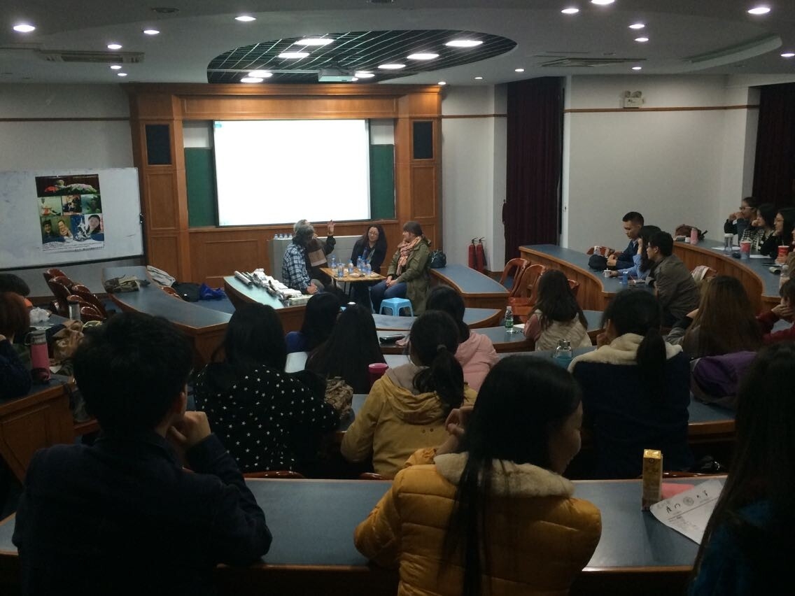 本次脱口秀由我系外教Stephen Ling主持,来宾包括:英语系系主任杨昆和外教Glen Ponse,以及大外部的外教Alexia Wilm和Change Parker。Stephen通过PPT展示了此次的话题East and West:China and The West及其相关的内容,随后与各位嘉宾对此依次进行了讨论。